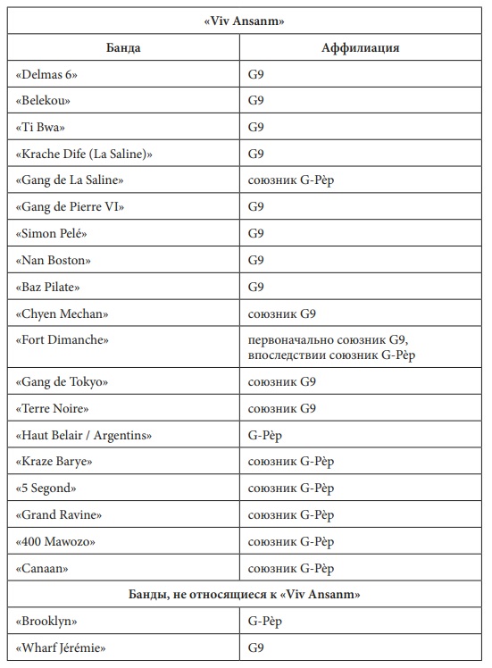 Большинство банд в Порт-о-Пренсе присоединилось к одному из этих альянсов, которые враждовали друг с другом. Насилие между ними, как правило, достигает пика вдоль линий, разделяющих территории конкурирующих группировок. Например, в трущобах Сите-Солей, расположенных к северу от столицы, снайперы из коалиции G9 часто стреляют без разбора в мирных жителей, живущих на территории, контролируемой конкурирующим альянсом G-Pèp. Эти факты делают особенно примечательным то, что в сентябре 2023 г. G9 и G-Pèp сформировали единый альянс, известный как «Viv Ansanm» («Жить вместе»), и начали скоординированное наступление, нацеленное на критически важную гражданскую инфраструктуру по всему Порт-о-Пренсу[9]. Вследствие уменьшения столкновений между соперничающими ПО, их члены все чаще нападают на мирных жителей и гражданскую инфраструктуру, включая школы, медицинские учреждения и гуманитарные организации. Совместные нападения «Viv Ansanm» на государственные учреждения, начатые 29 февраля 2024 г. для того, чтобы заставить премьер-министра А.Анри уйти в отставку, стали поворотным моментом и продемонстрировали способность коалиции ПО адаптироваться, вести переговоры и сплоченно действовать для достижения общих целей[10]. Эта серия нападений привела к тому, что 12 марта 2024 г. А.Анри объявил об уходе со своей должности. Таким образом, данный пример продемонстрировал способность «Viv Ansanm» действовать согласованно, единым фронтом. В таблице мы привели названия основных банд и их альянсов, которые доминируют на территории Гаити. Всего же в этой стране насчитывают порядка 200–300 группировок.
