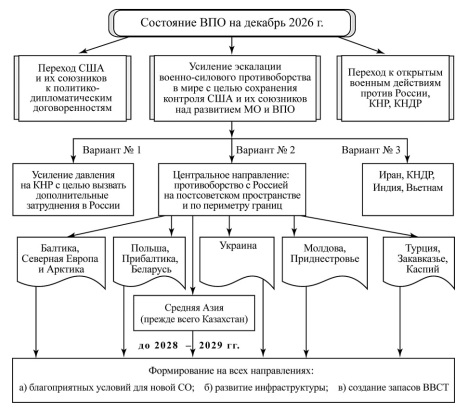 С точки зрения внутриполитической, а также политико-психологической, следует понимать, что Украина уничтожается и одновременно частично уничтожает Россию, что является с точки зрения США и их союзников идеальной моделью военно-силового противоборства с нашей страной. При этом «миролюбивая» риторика Д. Трампа гарантирует, что Россия не будет принимать против США и их войск за пределами национальной территории радикальных мер. Эскалация в этом направлении ведёт к контролю над политическими и военными рисками, нанося максимальный ущерб России. В целом такая достаточно последовательная и прогнозируемая линейная логика развития этого варианта базового сценария ВПО в 2026-м и в последующие годы может выглядеть в следующем виде (рис. 2):