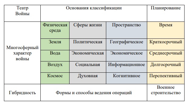 Что изменилось? Изменились пространственно-временные параметры, средства обработки информации и доставки средств поражения, диктующие необходимость уточнения принципов планирования военного строительства и строительства вооруженных сил. Сегодня научно технический прогресс (НТП) многократно усиливший возможности человека, меняет пространственно временные параметры жизнедеятельности и принципы управления общественной борьбой. Соответственно меняются формы и способы обеспечения военной безопасности и ведения вооруженной борьбы. Война поистине становится тотальной и многосферной. Если проводить классификацию многосферности по различным основаниям, то это будет выглядеть следующим образом (таблица 1).