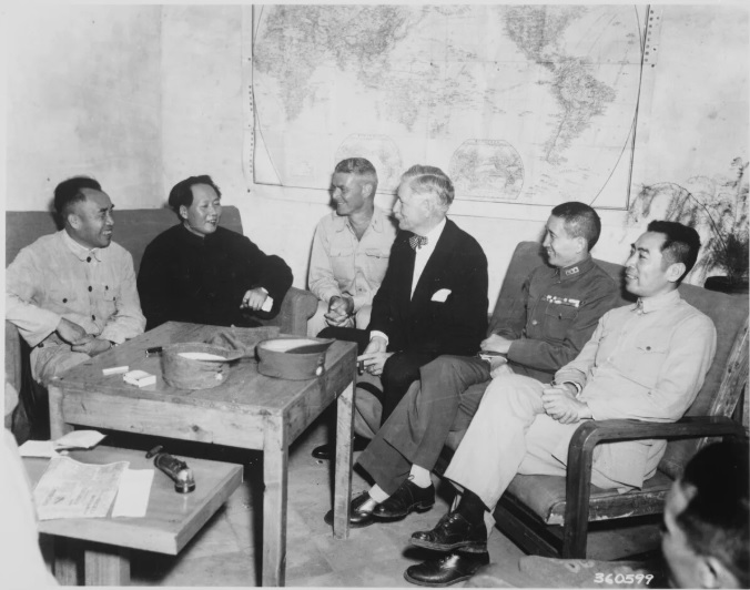 27 августа 1945, Яньань, встреча Мао Цзэдуна с прибывшими послом США Хёрли и представителем Гоминьдана Чжан Чжичжуном.