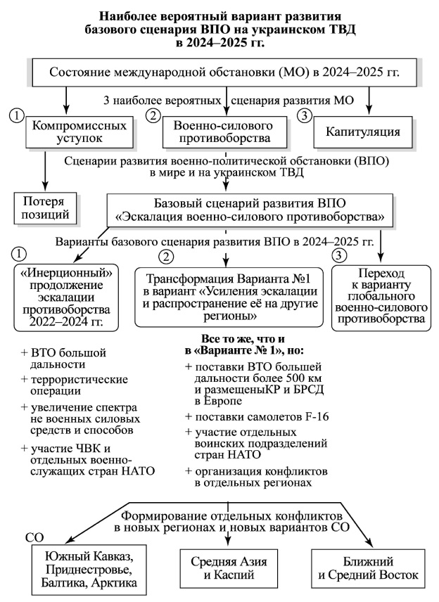 В этом прогнозе (в конце 2023 года) говорилось о том, что: «В 2024 году этот базовый сценарий развития ВПО вероятно будет реализовываться в одном-двух (из 3-х возможных) своих вариантов». Считалось, что «Наиболее вероятно – в «Варианте № 2», который, в свою очередь предполагает свою конкретизацию в формировании нескольких СО в мире и на украинском ТВД»[9]. Например, на севере, вокруг Харькова, в центре – Донбасский район, в Запорожье и в районе Херсона, и Николаева[10], а также других регионах – Закавказье и на Ближнем Востоке (события в Закавказье и в Сирии, а позже и в Палестине, и в Иране это подтвердили).