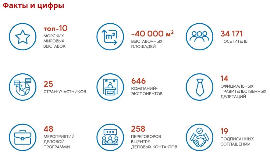 Общая площадь экспозиции составит около 50 000 кв. м. Более 700 экспонентов представят свои передовые разработки и технологии, охватывающие все аспекты морской отрасли – от судостроения и судоходства до освоения океана и шельфа. По традиции мероприятие привлекает свыше 35 000 участников из России и более 30 стран мира.