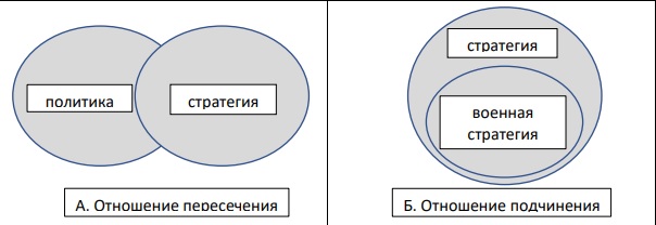 Поэтому многие теоретики вполне обоснованно считают, что политика по отношению к стратегии обладает первенством. Это утверждение не совсем корректно с точки зрения формальной и неформальной логики. Формально, при наличии общих свойств, каждому понятию присущи существенные признаки, которые не входят в объем другого понятия. Поэтому их соотношение следует рассматривать как отношение пересечения, а не подчинения. Отношение подчинения имеют понятия «стратегия» и «военная стратегия», когда объем одного понятия полностью входит в объем другого, более широкого понятия. Схематично с помощью кругов Эйлера соотношение этих понятий будет выглядеть следующим образом (рисунок 1).