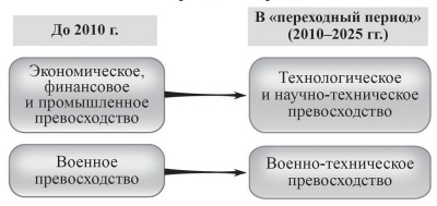«Переходный период» до 2025 года покажет насколько технологическая мощь США сможет компенсировать растущую экономическую мощь КНР. Не случайно то, что Д.Трамп объявил самой главной угрозой для США планы КНР стать мировым технологическим лидером к 2025 году. Акции США в отношении КНР в 2018 году во многом были мотивированы именно стремлением США ограничить утечку технологий и затруднить для КНР технологическое развитие. Этим же объясняется и подлинный смысл санкций против России, которая, по мнению правящей элиты США, должна технологически закрепиться среди отсталых государств, что автоматически ликвидирует её военно-политические амбиции.