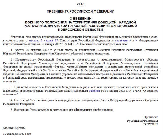 Так, 19 октября 2022 года Указом Президента РФ № 756 было введено военное положение на территориях Донецкой Народной Республики, Луганской Народной Республики, Запорожской и Херсонской областей с ноля часов 20 октября 2022 года [5].