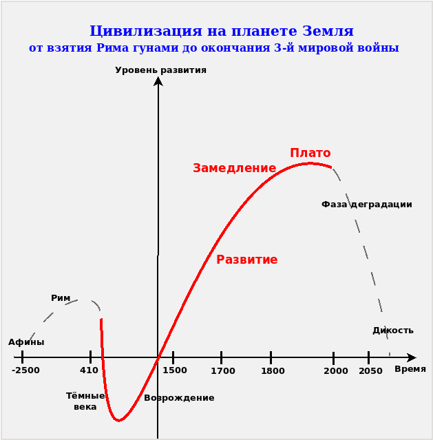 Существует немало современных попыток вычленить некие закономерности в развитии человечества, системы МО-ВПО, и, как следствие, - её неизбежные проекции на состояние СО. Как оптимистических, так и пессимистических. Для целей нашей работы необходимо иметь самое общее представление о закономерностях развития человеческой цивилизации и его влияние на состояния ВПО. Например – следующий график говорит о том, что некая общая человеческая цивилизация «на излете», вступает в фазу деградации, которая характерна разделением на цивилизационные автаркии и неизбежную хаотизацию МО-ВПО. Вероятно, что она разделится на автономные локальные человеческие цивилизации, которые будут развиваться по своим законам, естественно, не в полном отрыве друг от друга, но существенно автономно. С точки зрения анализа современного состояния ВПО это подтверждает вывод о нарастающей автаркии и хаосе, а значит – растущей роли национальных институтов, прежде всего, силовых, включая военных.