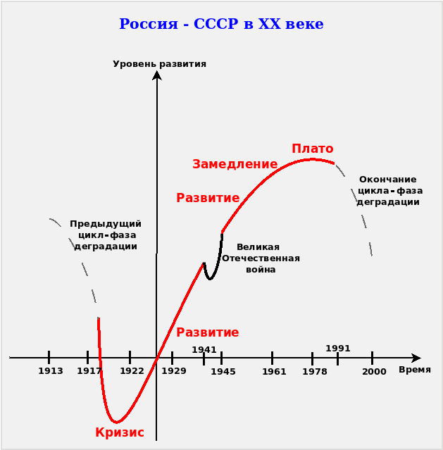Исторически этот график может выглядеть таким следующим образом, как показано на рисунке. Можно спорить о деталях – этот график слишком абстрактен,- но, тем не менее выидно, что в развитии цивилизаций присутствует цикличность, подтверждаемая историческими наблюдениями, а, главное, фаза «деградация» и распад.