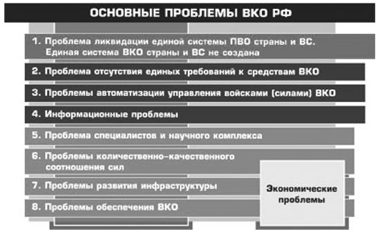 Сегодня различные эксперты и начальники по-разному оценивают проблемы российской ВКО. Так, В. Барвиненко и Ю. Аношко, например, выделяют следующие, подчеркивая, что «при формировании войск ВКО не прислушались к рекомендациям ученых, которые многие годы» предлагали создать стратегический орган управления, имеющий соответствующие обязанности и права по управлению всеми войсками и силами ВКО и объединенной системой ПВО ОДКБ. Более того, тесные связи задач и действий войск (сил) ВКО и авиации требуют создавать общее Воздушно-космическое командование.