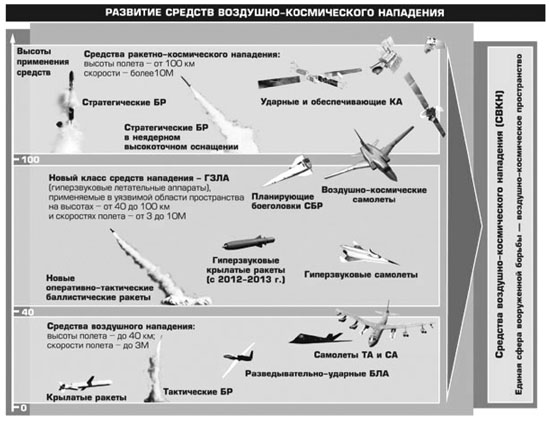 «Во-вторых, – продолжает Ю. Криницкий, – космическое и воздушное пространство сливается в единую воздушно-космическую сферу вооруженной борьбы. Космос осваивается в военных целях. А значит, и объем задач, возлагаемых на силы ПВО (теперь уже ВКО), расширяется. Увеличивается высотный диапазон объектов, подлежащих обнаружению, подавлению и уничтожению в войне. Ожидаемое появление гиперзвуковых воздушных целей (воздушно-космических самолетов) будет означать очередной научно-технический прорыв в развитии СВКН»[23].