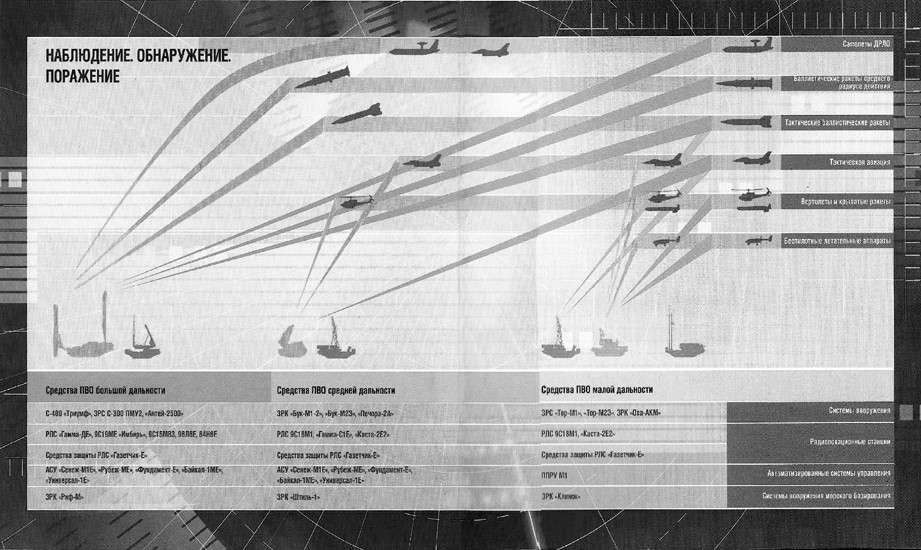 Особое значение для реализации идеи евразийской ВКО приобретает развитие в России эффективной системы воздушно-космической обороны, охватывающей все возможные области противостояния – от стратегической ПРО до ВКО в отдельных воинских частях. Пока что эта ситуация характеризуется следующим образом: на тактическом и оперативно-тактическом уровне существуют, модернизируются и создаются новые системы ВКО, способные обеспечить оборону отдельных объектов страны, но на уровне стратегическом – вопрос остается открытым. Это хорошо иллюстрирует рисунок, разработанный в концерне «Алмаз-Антей» в 2012 году: