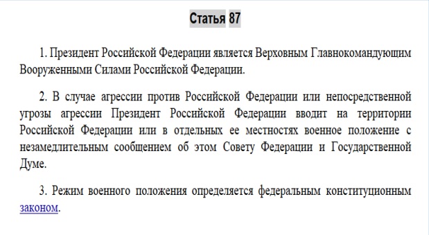 Военное положение вводится на территории Российской Федерации или в отдельных ее местностях на основании ст. 87 Конституции Российской Федерации и Федерального конституционного закона «О военном положении» (рисунок 1).